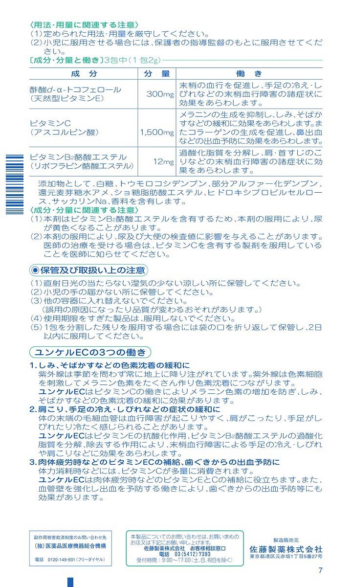 | (3包(1包2g)中) 酢酸d-α-トコフェロール(天然型ビタミンE):300mg ビタミンC(アスコルビン酸):1500mg ビタミンB2酪酸エステル(リボフラビン酪酸エステル):12mg 添加物として、白糖、トウモロコシデンプン、部分アルファー化デンプン、還元麦芽糖水アメ、ショ糖脂肪酸エステル、ヒドロキシプロピルセルロース、サッカリンNa、香料を含有します。 ★成分・分量に関連する注意 ・本剤はビタミンB2酪酸エステルを含有するため、本剤の服用により、尿が黄色くなることがあります。 ・本剤の服用により、尿及び大便の検査値に影響を与えることがあります。医師の治療を受ける場合は、ビタミンCを含有する製剤を服用していることを医師に知らせてください。 |