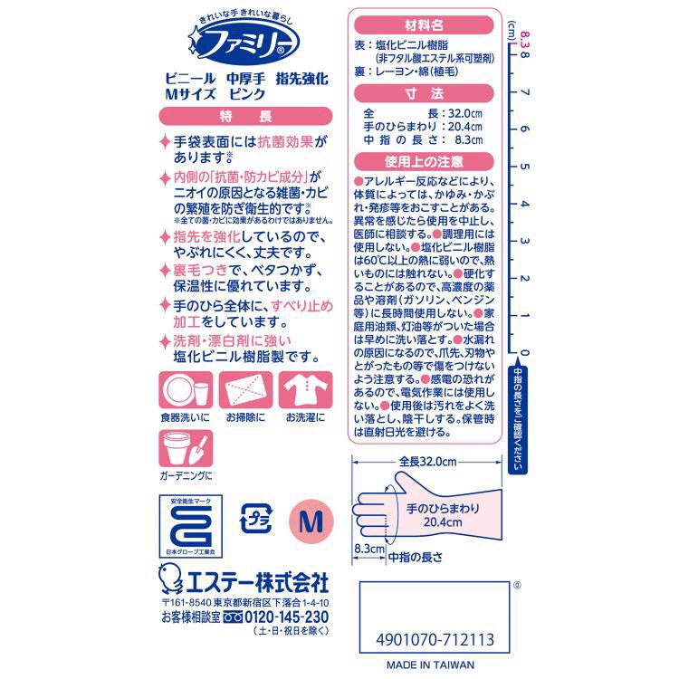 【ファミリー ビニール 手袋 中厚手 指先強化 Mサイズ ピンク 掃除 洗濯 食器洗い用の商品詳細】