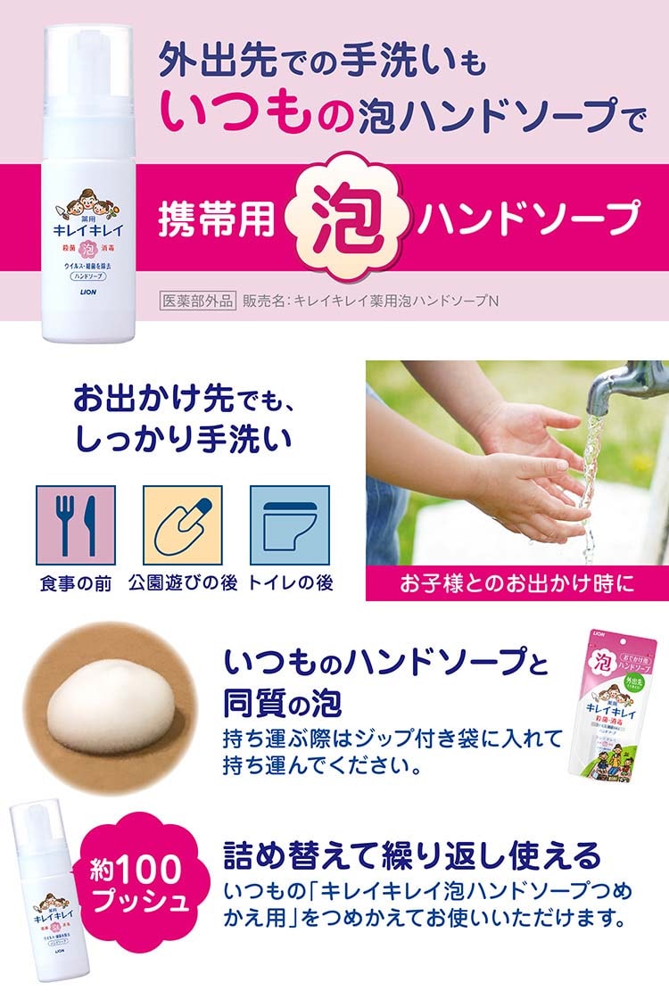 ●外出先でもいつもの「キレイキレイ薬用泡ハンドソープ」と同じ泡質で洗える薬用泡ハンドソープ携帯用。