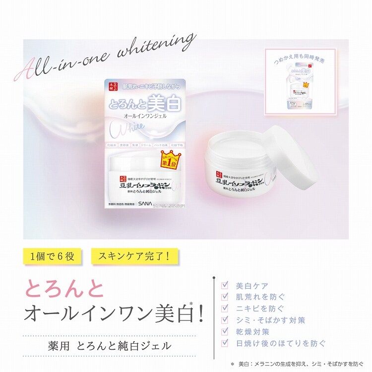 ●肌荒れ&ニキビ予防しながら美白(メラニンの生成を抑え、しみ、そばかすを抑える)するとろんとオールインワンジェル。