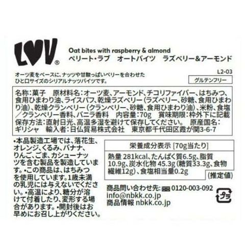 | 原材料名:オーツ麦、アーモンド、チコリファイバー、はちみつ、食用ひまわり油、ライスパフ、乾燥ラズベリー(ラズベリー、砂糖、食用ひまわり油)、乾燥クランベリー(クランベリー、砂糖、食用ひまわり油)、米粉、食塩/クランベリー香料、バニラ香料 |