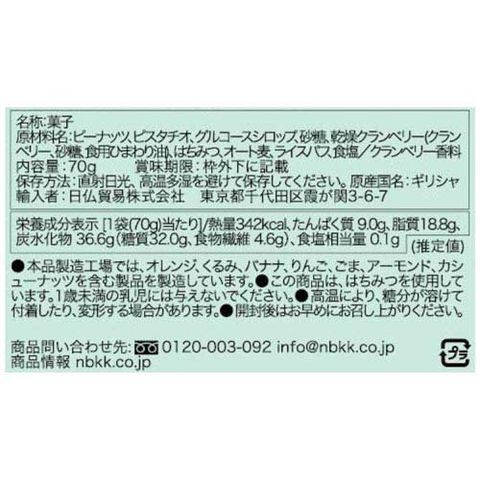 | 原材料名:ピーナッツ、ピスタチオ、グルコースシロップ、砂糖、乾燥クランベリー(クランベリー、砂糖、食用ひまわり油)、はちみつ、オート麦、ライスパフ、食塩/クランベリー香料 |