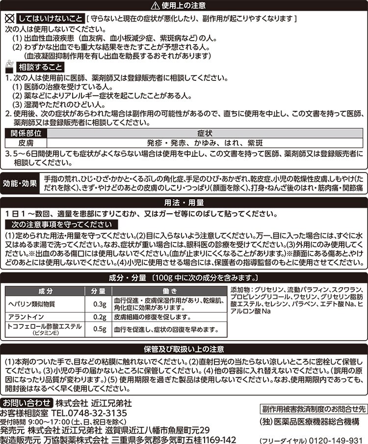| 手指の荒れ、ひじ・ひざ・かかと・くるぶしの角化症、手足のひび・あかぎれ、乾皮症、小児の乾燥性皮膚、しもやけ(ただれを除く)、きず・やけどのあとの皮膚のしこり・つっぱり(顔面を除く)、打身・ねんざ後のはれ・筋肉痛・関節痛 |