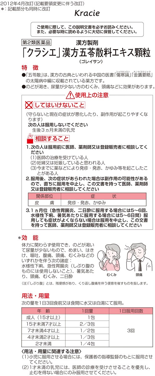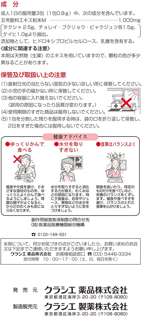 | (3包(2.4g)中) 五苓散料エキス粉末M:1000mg (タクシャ2.5g、チョレイ・ブクリョウ・ビャクジュツ各1.5g、ケイヒ1.0gより抽出。) 添加物:ヒドロキシプロピルセルロース、乳糖 ※本剤は天然物(生薬)のエキスを用いていますので、顆粒の色が多少異なることがあります。 |