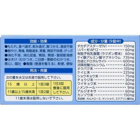 | 本剤は、淡灰褐色~淡褐色の素錠で、特異なにおいがあり、9錠中に次の成分を含有しています。 タカヂアスターゼN1:150mg リパーゼAP12:60mg 有胞子性乳酸菌(ラクボン原末):60mg ケイ酸アルミン酸マグネシウム:735mg 合成ヒドロタルサイト:600mg 沈降炭酸カルシウム:420mg オウバク末:105mg ケイヒ末:225mg ショウキョウ末:75mg チョウジ末:30mg ウイキョウ末:60mg L-メントール:9mg アルジオキサ:60mg カンゾウ末:150mg 添加物:カルメロース、サンショウ、ステアリン酸Mg |
