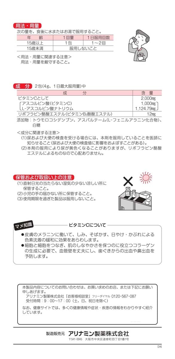| 2包(4g、1日最大服用量)中 成分 : 含量 ビタミンCとして : 2000mg ( アスコルビン酸(ビタミンC):1000mg L-アスコルビン酸ナトリウム:1124.79mg ) リボフラビン酪酸エステル(ビタミンB2酪酸エステル) : 12mg 添加物:トウモロコシデンプン、アスパルテーム(L-フェニルアラニン化合物)、白糖 ★成分に関連する注意 (1)尿および大便の検査を受ける場合には、本剤を服用していることを医師に知らせること(尿および大便の検査値に影響をおよぼすことがある)。 (2)本剤の服用により尿が黄色くなることがありますが、リボフラビン酪酸エステルによるものなので心配ありません。 |