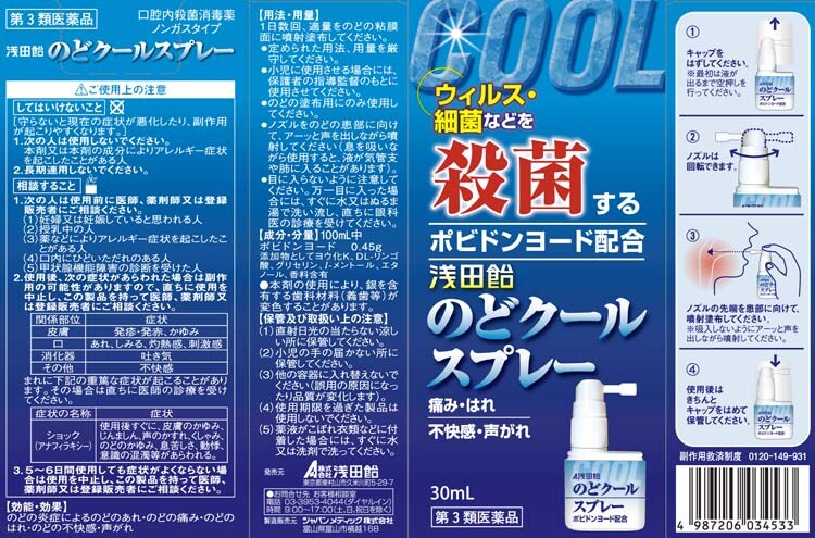 | 100mL中 ポビドンヨード:0.45g 添加物:ヨウ化カリウム、DL-リンゴ酸、グリセリン、L-メントール、エタノール、香料含有 |