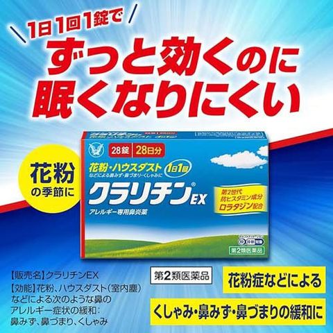 ●クラリチンEXは、第2世代抗ヒスタミン成分ロラタジンを含有するアレルギー専用鼻炎薬です。