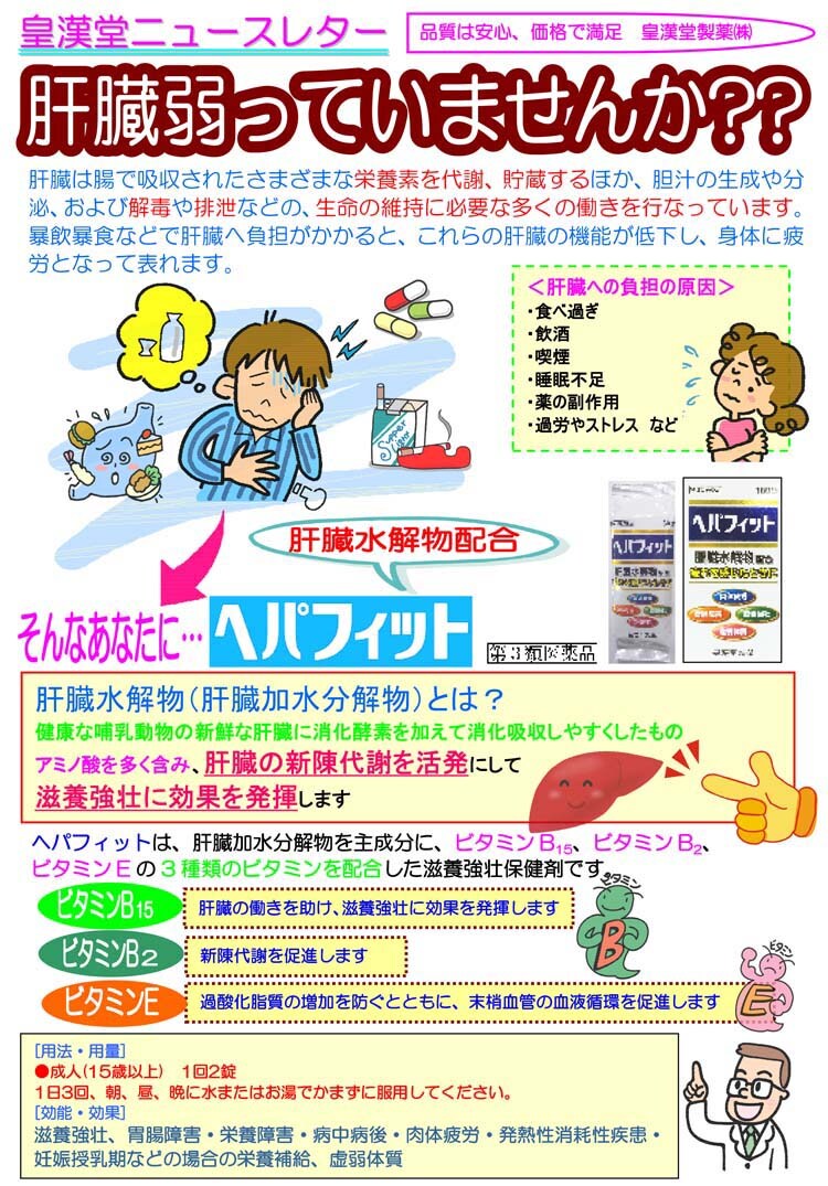 ●ヘパフィットは、健康な哺乳動物の新鮮な肝臓に、消化酵素を加えて消化吸収しやすくした肝臓加水分解物を主成分に、ジクロロ酢酸ジイソプロピルアミン(ビタミンB15)、リボフラビン(ビタミンB2)およびビタミンEの3種類のビタミンを配合した滋養強壮保健剤です。