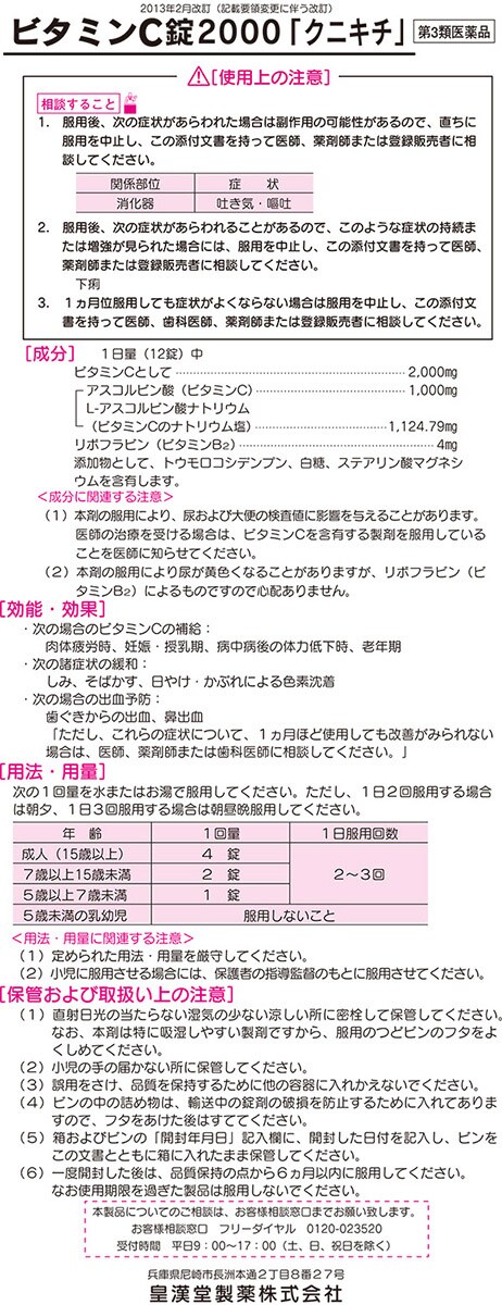 ●ビタミンC錠2000「クニキチ」は、12錠中に2000mgのビタミンCを含有したビタミンB2配合の製品です。