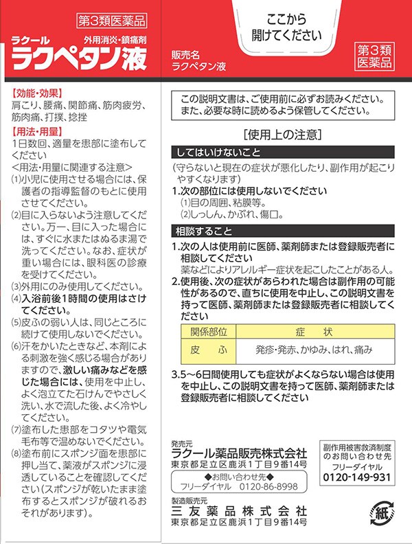 | (100mL中) サリチル酸メチル:2500mg L-メントール:3000mg クロルフェニラミンマレイン酸塩:100mg ニコチン酸ベンジルエステル:10mg ノニル酸ワニリルアミド:12mg 添加物:ハアセチルしょ糖、エタノール、プロピレングリコール |