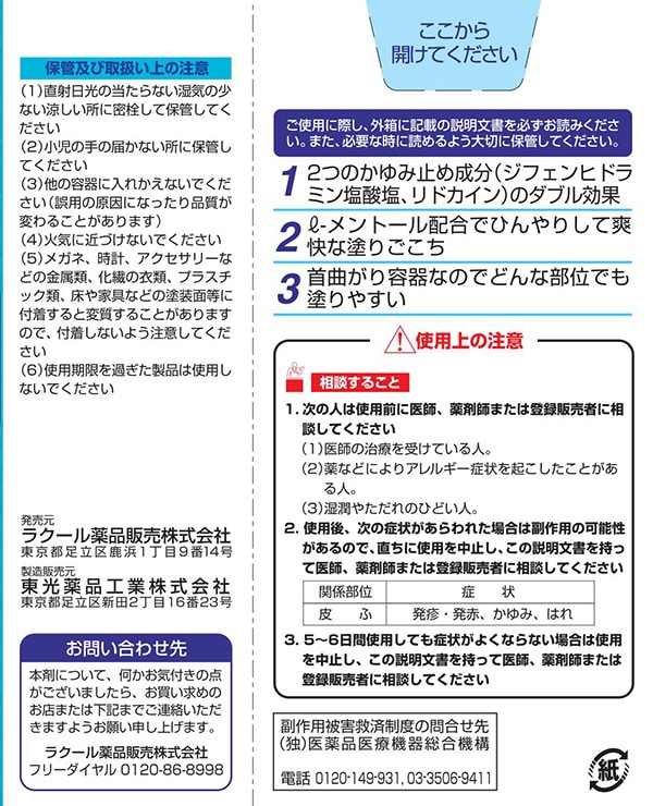 ●ジフェンヒドラミン塩酸塩とリドカインがダブルで鎮痒効果を発揮します。