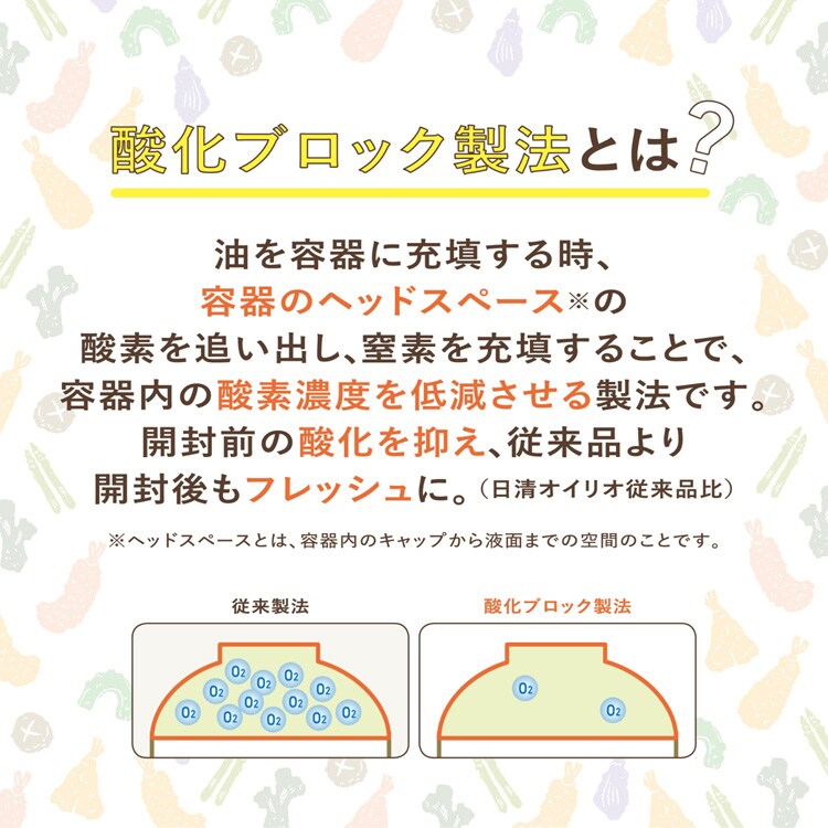 酸化を抑えてていねいに精製し、活性炭フィルターを使用して、油っこくない性状を生み出す「ライト&クリア製法」を採用