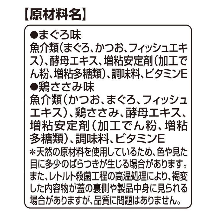 | ★まぐろ味 魚介類(まぐろ、かつお、フィッシュエキス)、酵母エキス、増粘安定剤(加工でん粉、増粘多糖類)、調味料、ビタミンE ★鶏ささみ味 魚介類(かつお、まぐろ、フィッシュエキス)、鶏ささみ、酵母エキス、増粘安定剤(加工でん粉、増粘多糖類)、調味料、ビタミンE ※天然の原材料を使用しているため、色や見た目に多少のばらつきが生じる場合があります。また、レトルト殺菌工程の高温処理により、褐変した内容物が蓋の裏側や製品中身に見られる場合がありますが、品質に問題はありません。 |