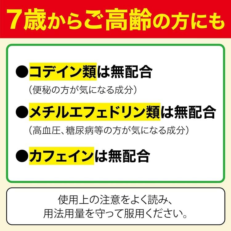 | 6錠中 [成分:分量] アセトアミノフェン:900mg デキストロメトルファン臭化水素酸塩水和物:45mg クロルフェニラミンマレイン酸塩:7.5mg グアイフェネシン:150mg 添加物として、リン酸水素Ca、CMC、ヒドロキシプロピルセルロース、ヒプロメロース、ステアリン酸Mg、マクロゴール、乳糖を含有します。 |