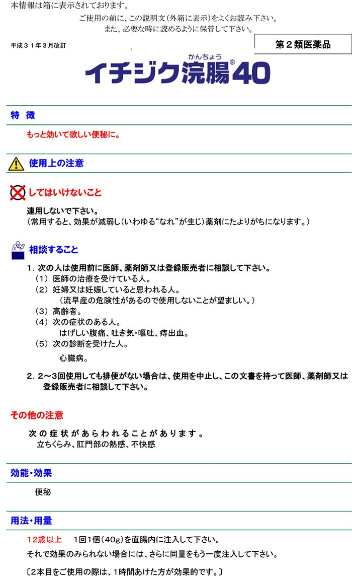 12歳以上:1回1個(40g)を直腸内に注入して下さい。