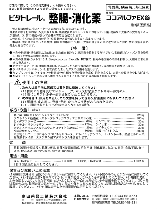 | (1日量(9錠中)) 糖化菌(納豆菌)(バチルススブチリスBN株):120mg ラクトミン(乳酸菌)(ストレプトコッカスファエカリスBIO株):100mg ビオヂアスターゼ:60mg ジメチルポリシロキサン:120mg センブリ末:30mg ケイヒ末:30mg ウイキョウ末:30mg メチルメチオニンスルホニウムクロライド(MMSC):30mg 沈降炭酸カルシウム:300mg 炭酸マグネシウム:300mg 添加物として、ヒドロキシプロピルセルロース、バレイショデンプン、L-メントール、結晶セルロース、軽質無水ケイ酪、ステアリン酪マグネシウムを含有します。 |