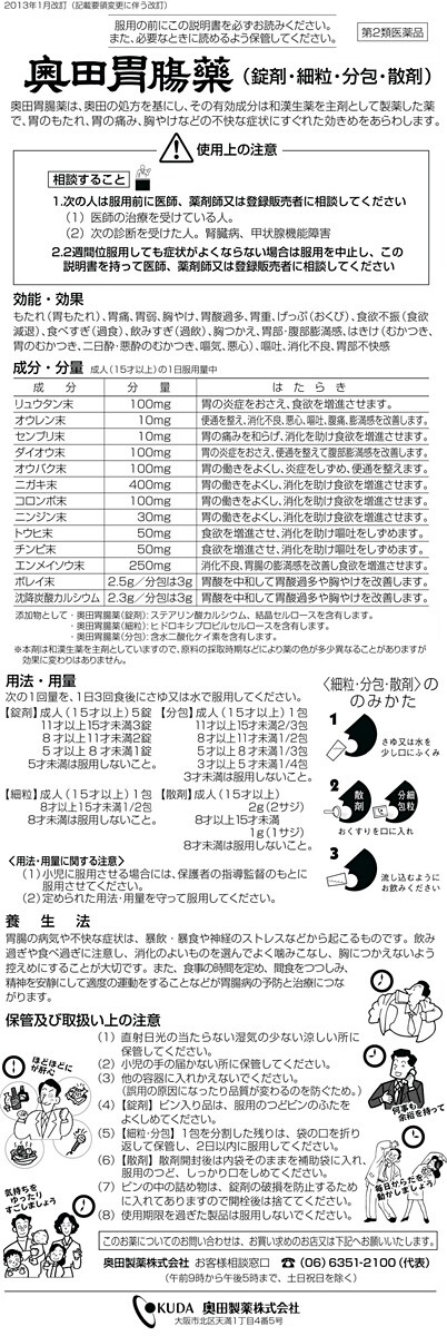 ●奥田胃腸薬は、奥田の処方を基にし、その有効成分は和漢生薬を主剤として製薬した薬で、胃のもたれ、胃の痛み、胸やけなどの不快な症状にすぐれた効きめをあらわします。