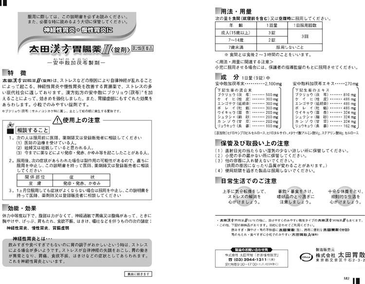 ●太田漢方胃腸薬II錠剤は、ストレスなどの原因により自律神経が乱れることによって起こる、神経性胃炎や慢性胃炎を改善する胃腸薬で、ストレスの多い現代社会に適しております。漢方処方の安中散にブクリョウ(茯苓)※を加えることによって、効きめを強化しました。また、胃アトニー(胃の機能低下)にもすぐれた効果をあらわします。小粒でのみやすい錠剤です。