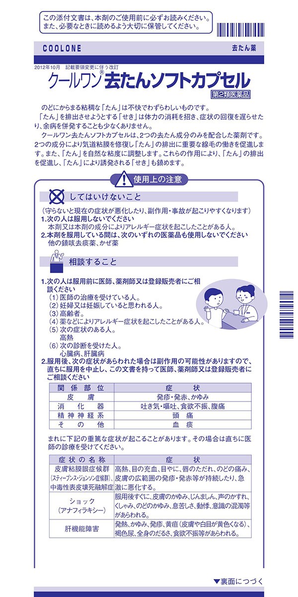 ●クールワン去たんソフトカプセルは、2つの去たん成分のみを配合した薬剤です。2つの成分により気道粘膜を修復し「たん」の排出に重要な線毛の働きを促進します。また、「たん」を自然な粘度に調整します。これらの作用により、「たん」の排出を促進し、「たん」により誘発される「せき」も鎮めます。