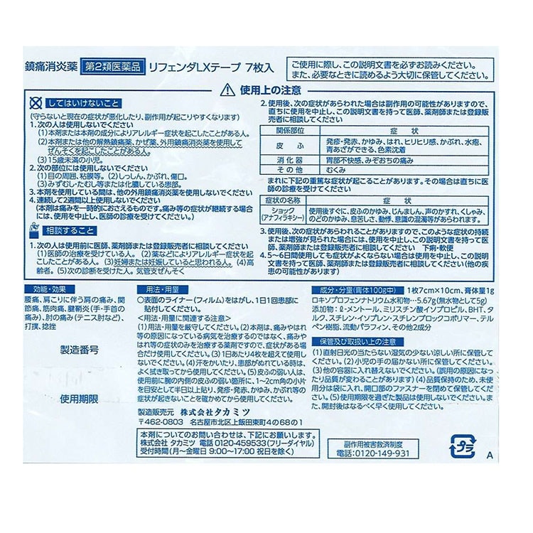 | 成分・分量(膏体100g中)1枚7cm*10cm、膏体量1g ロキソプロフェンナトリウム水和物:5.67g (無水物として5g) 添加物:l-メントール、ミリスチン酸イソプロピル、BHT、タルク、スチレン・イソプレン・スチレンブロックコポリマー、テルペン樹脂、流動パラフィン、その他2成分 |