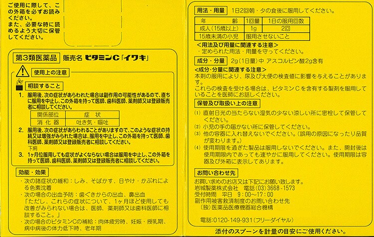 | (2g(1日量)中) アスコルビン酸:2g含有 ★成分・分量に関連する注意 本剤の服用により、尿及び大便の検査値に影響を与えることがあります。これらの検査を受ける場合は、ビタミンCを含有する製剤を服用していることを医師にお話し下さい。 |