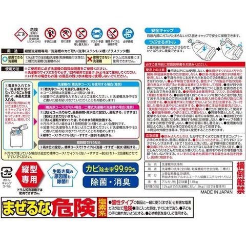 ・必ず単独で使用する。酸性タイプの製品や他の洗剤・漂白剤などが混ざると有毒な塩素ガスが発生して危険。