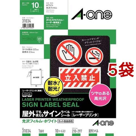 エーワン 屋外使える ラベル レーザー 光沢 フィルム 白 A4 1面 31034 (10シート×5セット)