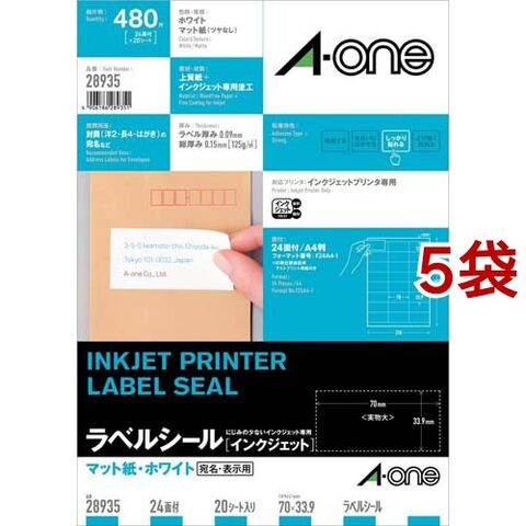 エーワン ラベルシール インクジェット 24面 70×33.9mm 28935 (20シート×5セット)