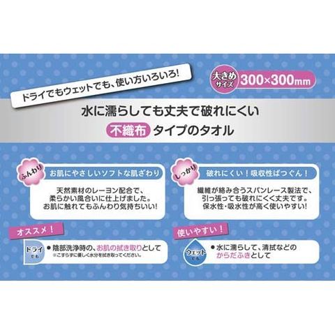 ・繊維が絡み合うスパンレース製法で、引っ張ったり、水に濡らしても丈夫で破れにくい不織布タイプのタオル。