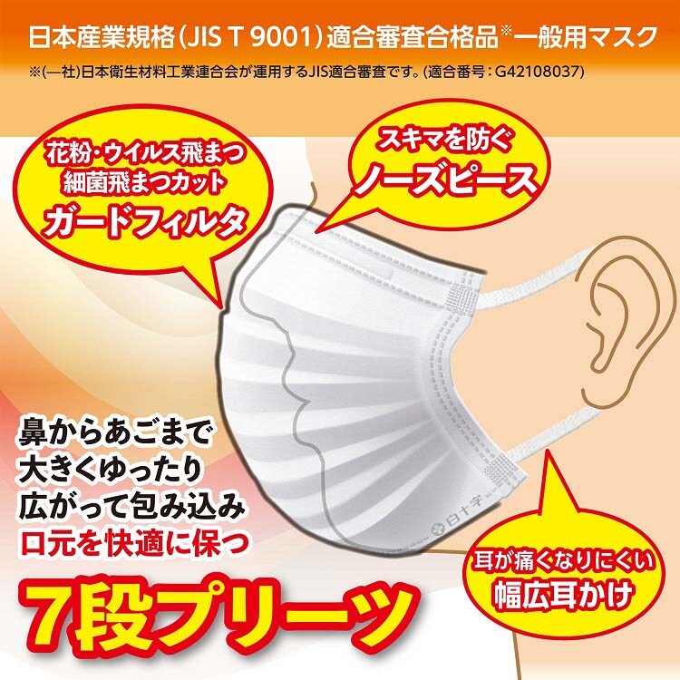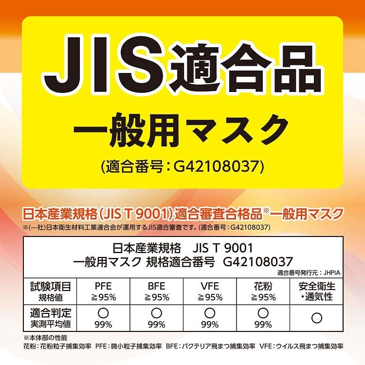 | 日本産業規格(JIS T 9001)適合審査合格品:一般用マスク 規格適合番号:G42108037 本体・フィルタ部:ポリプロピレン 耳ひも部:ポリエステル・ポリウレタン ノーズピース:ポリエチレン マスクサイズ:12.5cm*9cm |