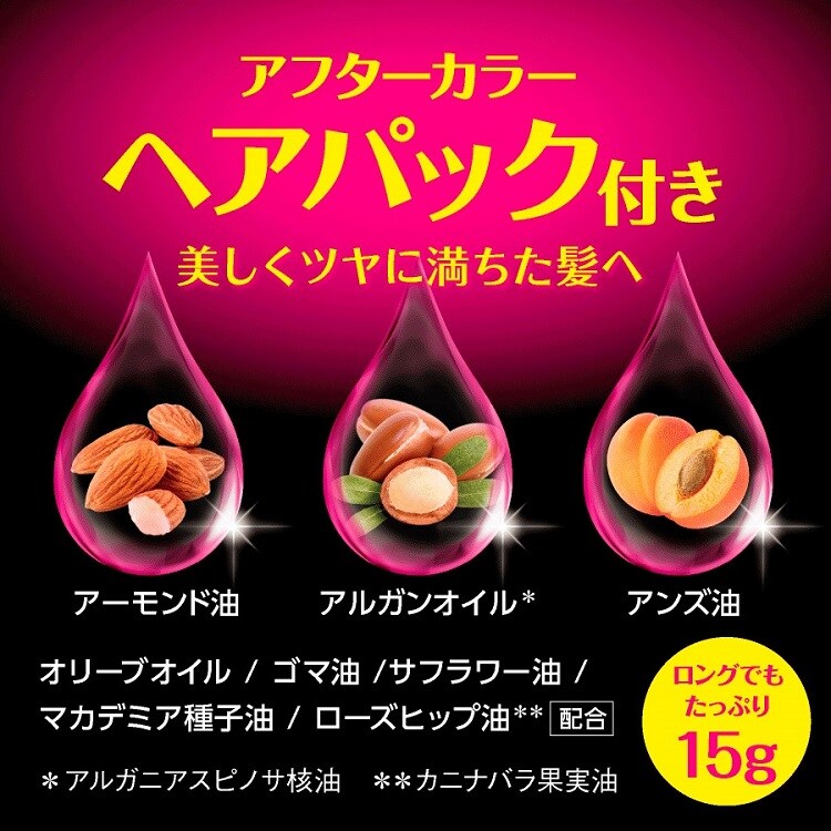 ●アーモンド油、アルガンオイル(アルガニアスピノサ核油)、アンズ油をはじめ厳選した8種のオイル(うるおい成分)配合のアフターカラーヘアパック付き。髪の奥深くからツヤめくなめらかな質感。