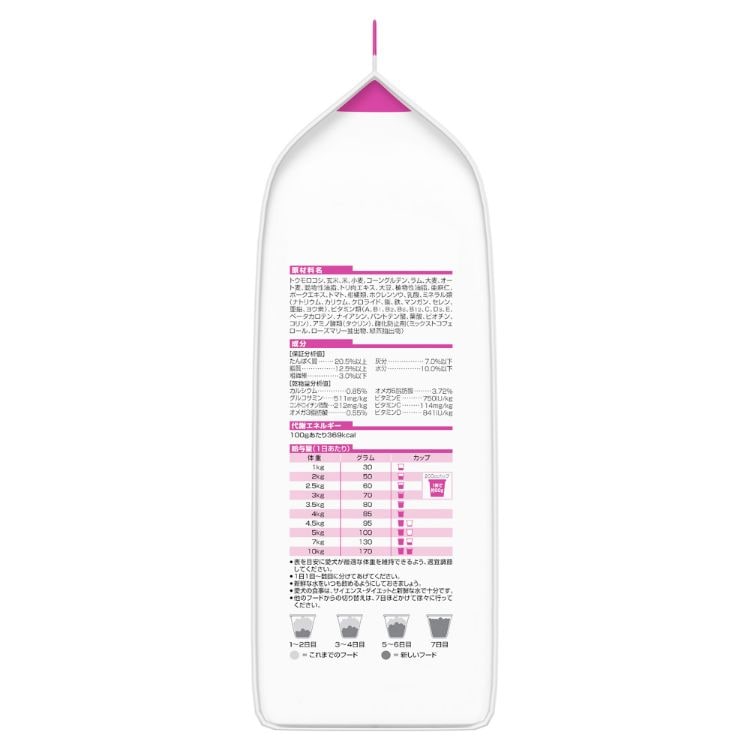 給与量(体重とグラム数)1kg:30g、2kg:50g、2.5kg:60g、3kg:70g、3.5kg:80g、4kg:85g、4.5kg:95g、5kg:100g、7kg:130g、10kg:170g (200ccカップ1杯で約90g)