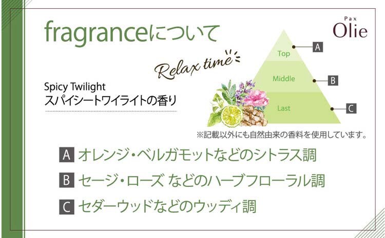 ●【スパイシートワイライトの香り】セージ・ローズマリー・バジルなどのハーブ調香りが、ベルガモットなどの柑橘のみずみずしい香りやローズ・イランイラン・オレンジフラワーなどの上品なフローラル調香り、ウッディ調の温かみとほのかな甘さとともに膨らむ穏やかな残香が続く香り。