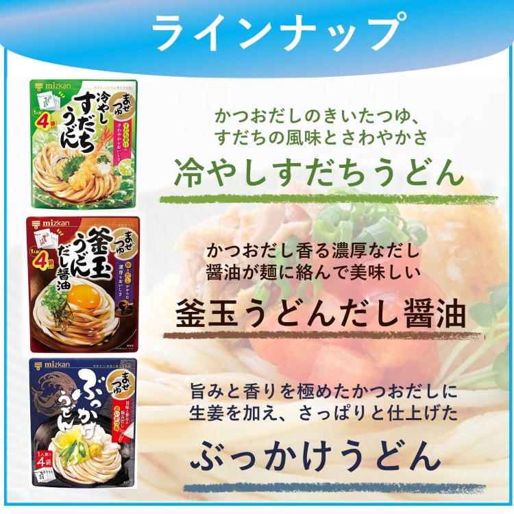 ●麺にかけて混ぜるだけでいつもと違う美味しさが楽しめる麺用調味料シリーズです。