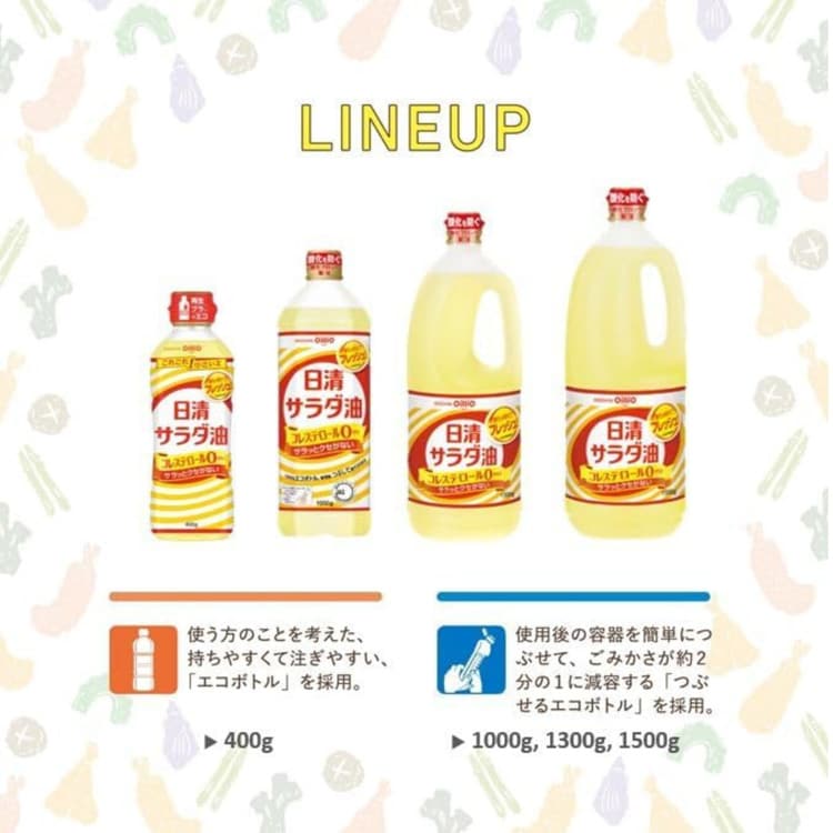 熱安定性のよいなたね油と、クセがなく、うまみのある大豆油をブレンドした食用油です。揚げ物から和え物、マリネまで、どんな料理もおいしく仕上がるので、用途に合わせて幅広くお使いいただけます。ボトルは使用後つぶして捨てられるエコボトルです。