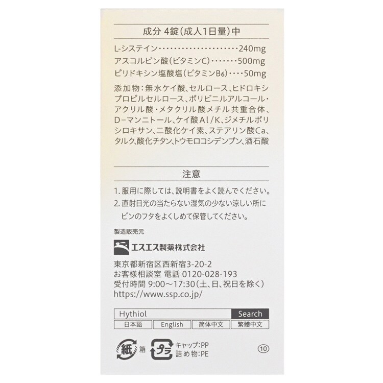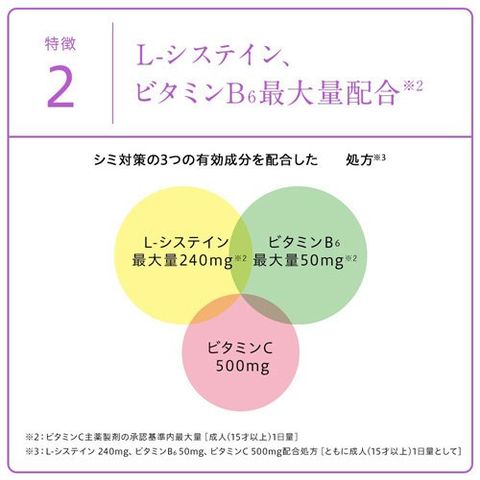 | 4錠(成人1日量)中 L-システイン:240mg、アスコルビン酸(ビタミンC):500mg、ピリドキシン塩酸塩(ビタミンB6):50mg 添加物:無水ケイ酸、セルロース、ヒドロキシプロピルセルロース、ポリビニルアルコール・アクリル酸・メタクリル酸メチル共重合体、D-マンニトール、ケイ酸Al/K、ジメチルポリシロキサン、二酸化ケイ素、ステアリン酸Ca、タルク、酸化チタン、トウモロコシデンプン、酒石酸 ・本剤の服用により、尿及び大便の検査値が影響を受けることがあります。医師の検査を受ける場合は、ビタミンCを服用していることを医師にお知らせください。 |