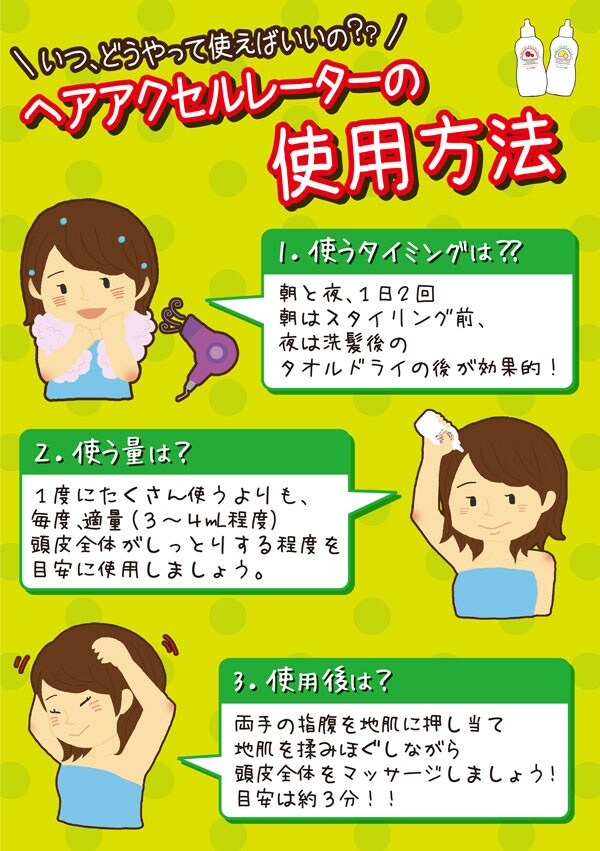 ・適量を頭皮にふりかけ、よくマッサージしてください。