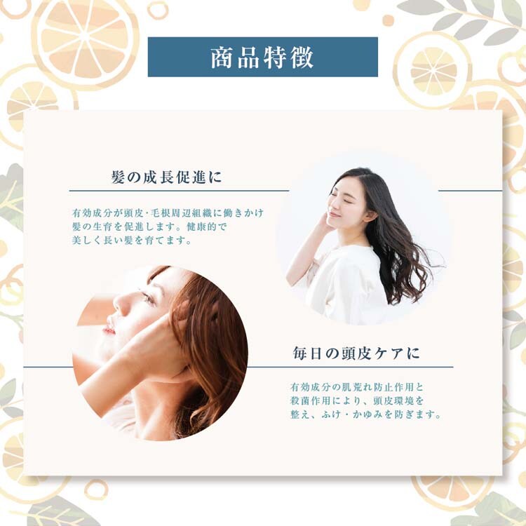●ツヤとうるおいのあるサラサラヘアを育て、フケやカユミも防ぎ、清潔に保ちます。