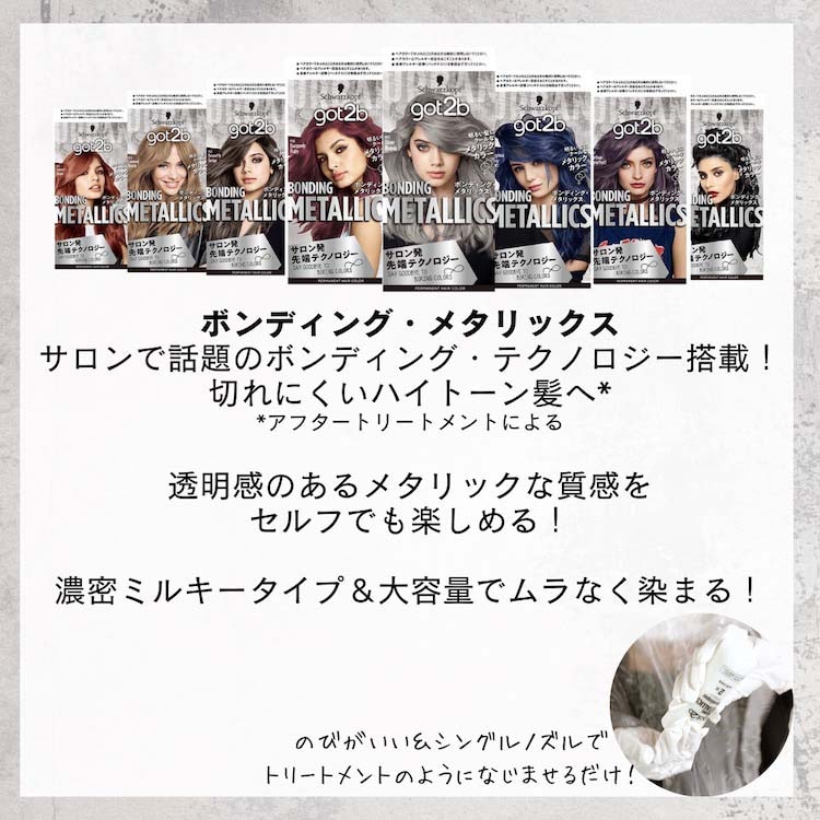 ●サロンで話題のボンディング・テクノロジー搭載。切れにくいハイトーン髪*へ。大胆なメタリックカラーを。*アフターカラートリートメントによる。