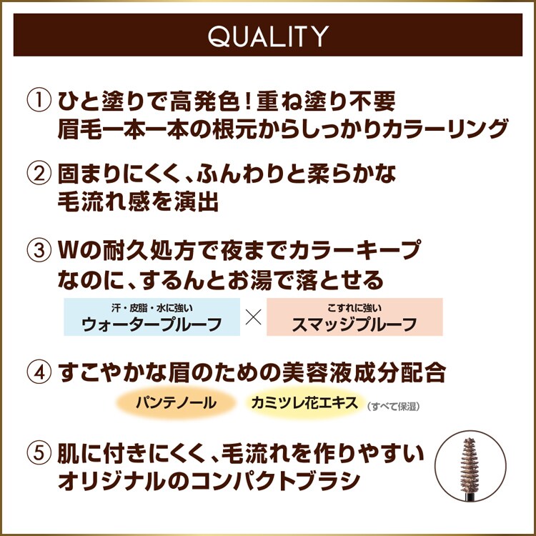 ●Wの耐久処方で夜までカラーキープなのに、するんとお湯で落とせる(ウォータープルーフ*スマッジプルーフ)。
