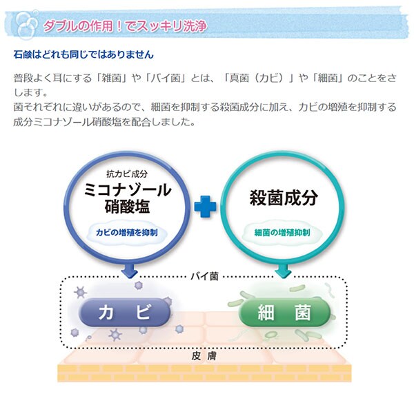 ●真菌(カビ)の増殖を抑える、抗真菌(カビ)成分・ミコナゾール ナイトレートを配合した、薬用泡石鹸です。しっかり洗浄殺菌します。
