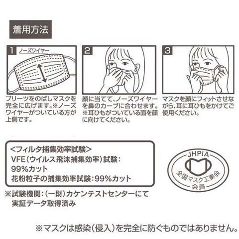 | ・スペック 表地:ポリエステル フィルタ:ポリプロピレン(メルトブロー不織布) 裏地:ポリプロピレン 耳ひも部:ポリエステル、ポリウレタン ノーズワイヤー:ポリエチレン ・本体サイズ:約145*90mm ・枚数:10枚入り |