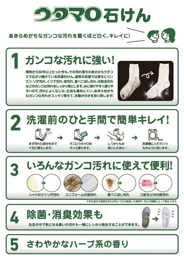 ・石けんを塗った後、そのまま放置したり、泡立てずに洗濯機に入れると、石けんが溶け残ったり、蛍光増白剤がムラづきすることがあるのでご注意下さい。