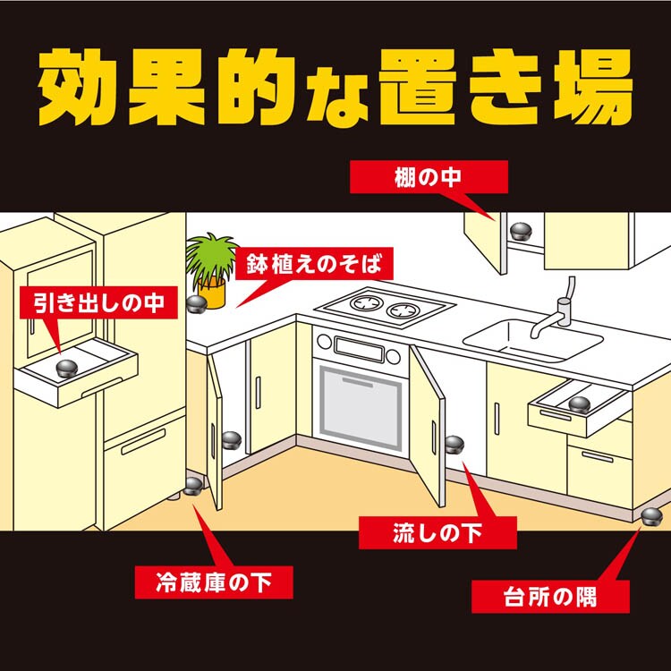 (効果的な置き場所)引き出しの中・鉢植えのそば・冷蔵庫の下・棚の中・流しの下・台所の隅