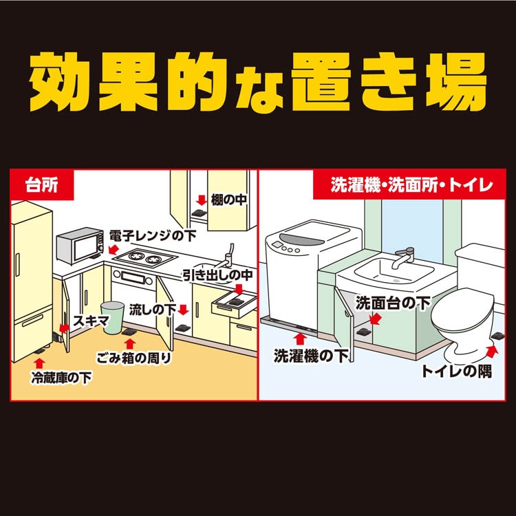 ・電子レンジの下や冷蔵庫の下、物と物の間のすき間などに10平方メートル(約6畳)あたり2個から4個置いてください。