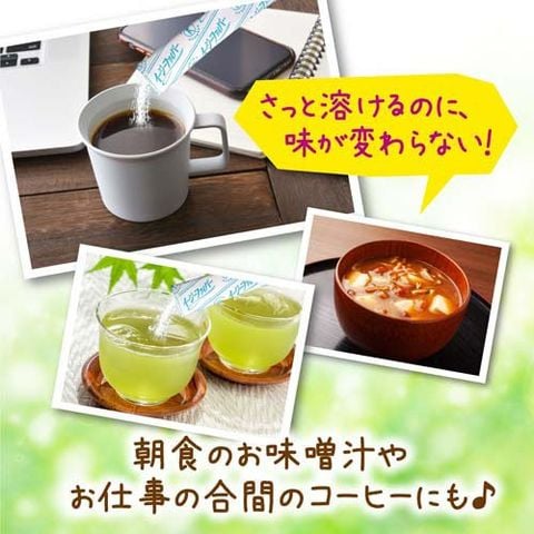 ●ほとんど無味・無臭なので、お茶やジュースなどにいれても、味や香りを変えず、固まることなくさっと溶けます。