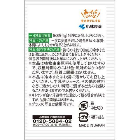 | 1袋3gあたり 熱量:11.8kcal、たんぱく質:0.4g、脂質:0.07g、炭水化物:2.4g、食塩相当量:0.00044 ~ 0.018g 関与成分 キトサン:294mg |