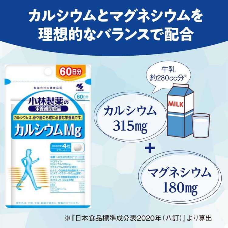 ●小林製薬の「カルシウムMg」サプリメントは、骨や歯の健康をサポートするカルシウム(calcium)とマグネシウム(magnesium)を約2:1の理想的なバランスで配合。