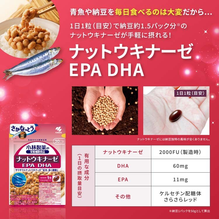 ●小林製薬のナットウキナーゼ EPA DHA サプリメントは、中高年の健康維持に役立つナットウキナーゼサプリ。